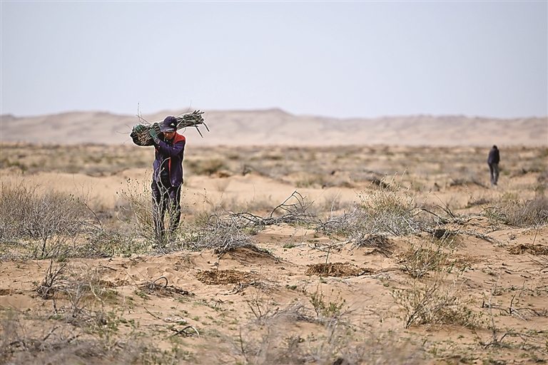 内蒙古库布其沙漠,治沙工人搬运沙柳。新华社发